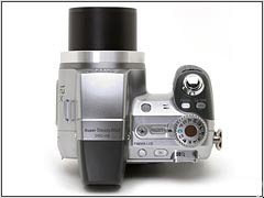 Тыльная часть камеры - место, где мы находим наиболее важные внешние различия с H1; экран съежился с 2.5 до 2.0 дюймов, и некоторые средства управления были перемещены. Наверху, рядом с электронным видоискателем, находятся кнопки (слева) видоискатель/LCD, новая кнопка режима проигрывания (которая манипулирует выбором режимов) и качели zoom. Ниже рычажка zoom, направо от текстурного захвата для большого пальца, находятся кнопки меню и дисплея (для изменения количества показываемой на экране информации). При перемещении вниз корпуса мы находим стандартный четырехсторонний контроллер и кнопку размера изображения, которая также используется для удаления изображений в режиме просмотра. Каждое из четырех направлений имеет добавочные функции, используемые в режиме съемки – назначения вспышки, макро, таймер и AE компенсация (долгожданное дополнение, отсутствующее в H1). Наша единственная (незначительная) жалоба по расположению на тыльной панели - то, что легко можно случайно нажать кнопки большим пальцем при попытке использовать H2 одной рукой.