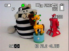 | Циклическое нажатие кнопки дисплея переключает между тремя режимами показа; базовый (показывается только рамка фокуса, режим вспышки, макро), расширенный и расширенный с гистограммой (как показано здесь). Вы получаете те же режимы, если используете электронный видоискатель. | Половинное нажатие кнопки спуска, и камера вычислит экспозицию (AE) и фокус (AF), определив апертуру и скорость затвора. Рамка фокуса станет зеленой, и на дисплее высветится предупреждение, если скорость затвора ниже нужного уровня. |