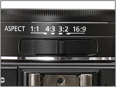 На верху барреля объектива - физический переключатель для установки желаемого формата. Новое для LX5 - установка 1:1 для съемки квадратных изображений, по существу, это обрезанная 4:3 рамка. Она находится рядом с установками форматов 4:3, 3:2 и 16:9, которые мы видели и в предыдущих камерах серии LX. |