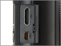 Маленькая пружинная створка на правой стороне LX5 (когда камера повернута к лицу своей обратной стороной) скрывает мини HDMI и AV выход/Цифровой разъем. |
