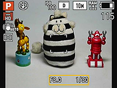 В режиме live view (съемка) LX5 показывает много информации на своем 3 дюймовом LCD экране. По умолчанию показывается статус всех ключевых съемочных параметров, а также статус батареи, качества изображения и стабилизации изображения. LX5 недостает эквивалента электронному виртуальному горизонту P7000, но, подобно другим двум камерам в этой группе, в помощь композиции может быть включен показ сетки правила третей. Кроме того, Вы можете отключить всю экранную информацию.