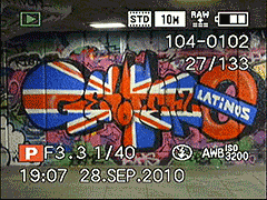 | В режиме обзора изображения, это - основной вид метаданных – имя файла и дата и время, когда взят снимок. | Одно нажатие кнопки ‘Disp’ добавляет информацию об экспозиции. |