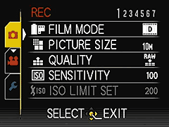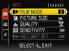 | 'Q Меню' является полезным средством для доступа к основным характеристикам LX5. Отсюда можно быстро изменять ключевые съемочные установки, подобно ISO, балансу белого и принципу AF. | Если Вы не можете найти то, что Вам нужно, в 'Q меню', тогда пора приступать к длительному путешествию по меню LX5. В целом имеется три таблицы - Запись (съемка), Видео установки и Настройки. |
