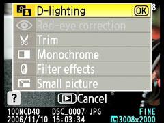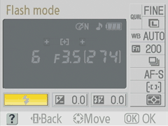 Нажмите 'i' (установочную) кнопку, чтобы переключиться на установочный режим, здесь для навигации по экрану используется мульти-селектор (4х сторонний джойстик) и копка ОК для изменения установок. Nikon полностью реализовал преимущества изменения установок на экране, объединив замену установок с показаниями об эффективности замены или помощью в выборе правильной опции. Например, при замене качества изображения Вы можете увидеть оценочный размер файла и количество остающихся кадров, при замене баланса белого показываются примеры сцен, которым данный баланс белого может соответствовать.