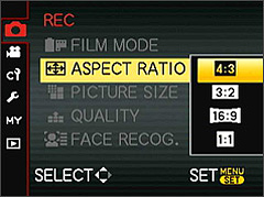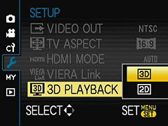 | Если на карте памяти есть какие-нибудь 3D изображения, эта опция меню позволяет Вам воспроизводить их на совместимом 3D телевизоре. | GH2 может снимать в 4 пропорциях. Самое верхнее эффективное разрешение достигается в режиме 4:3, снижаясь до 15MP при установке на 3:2, 14MP - при установке на 16:9 и 12MP - на 1:1. |