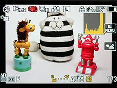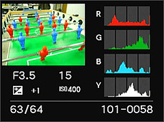 | ...или изучения гистограммы – показываются все три канала плюс яркость... | …или, если Вы предпочитаете менее загроможденный обзор, можно отключить все съемочные данные. |