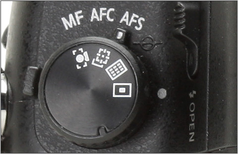 В левом верхнем углу GH2 мы находим еще один диск, на этот раз для установки AF шаблона/типа. Подобно колесику режимов экспозиции на правой стороне верхней пластины, это колесико также имеет маленький переключатель вокруг окружности для установки фокусировочного режима (MF, AFC, AFS). Как колесико, так и переключатель меньше, чем их аналоги в правой верхней части камеры, что делает их пропорционально более неудобными для регулировки в некоторых ситуациях (например, в холодную погоду). Сразу направо - приятно широкий механический спуск для встроенной вспышки GH2.