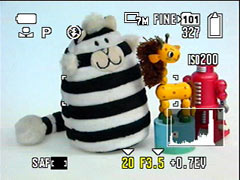 | Циклическое нажатие кнопки дисплея переключает между тремя режимами показа; базовый (показывается только рамка фокуса, режим вспышки, макро), расширенный и расширенный с гистограммой (как показано здесь). Вы получаете те же режимы, если используете электронный видоискатель. | Половинное нажатие кнопки спуска, и камера вычислит экспозицию (AE) и фокус (AF), определив апертуру и скорость затвора. Рамка фокуса станет зеленой, и на дисплее высветится предупреждение, если скорость затвора ниже нужного уровня. |