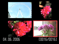 Меню в режиме воспроизведения позволяет Вам выбирать между мозаикой из 4, 9 или 16 маленьких изображений или 'Редактор просмотра файлов', который показывает шесть уменьшенных изображений одновременно, а также позволяет Вам быструю прокрутку между папками.