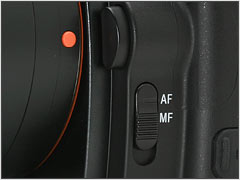 На передней панели слева расположено крепление объектива, которое окружают - кнопка предварительного просмотра ГРИП (нажмите, чтобы временно диафрагмировать объектив для замера или выбора апертуры). На передней панели справа - кнопка разблокировки объектива, ниже переключатель режима Фокусировки, который позволяет Вам выбирать между авто и ручной фокусировкой.