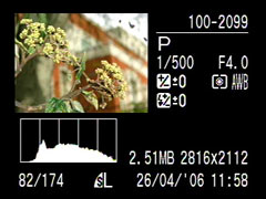 | Режим просмотра не загружает дисплей, линия основной информации показывает название файла, дату & время съемки и качество. | Один из трех альтернативных режимов просмотра включает показ гистограммы и информацию об экспозиции. |