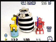 | Здесь дисплей в полностью автоматическом режиме, с выбором информационного оверлея. Вы можете видеть сразу ваш режим экспозиции, установку компенсации AE, режим вспышки, размер / качество изображения и режим AF. Синие скобки указывают область AF (в этом случае, использована трех областная AF). |