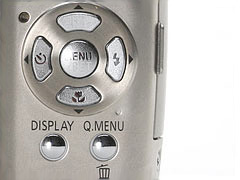 Элементы управления расположены справа от экрана и довольно просты. Имеются кнопки для компенсации экспозиции, вспышки, автоспуска и макро режима на четырех стороннем контроллере. Кнопка Быстрого меню дает Вам доступ к самым важным установочным параметрам, включая ISO, Баланс Белого и режим съемки. Выгравированные иконки могут быть трудно видимы при некотором освещении. |