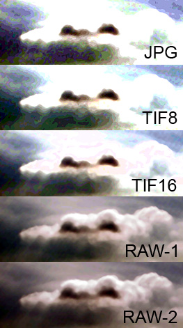 Не удержусь и приведу ещё одну, возможно, даже более наглядную, иллюстрацию различий RAW/TIFF/JPG форматов для съёмки (по совету читателей).